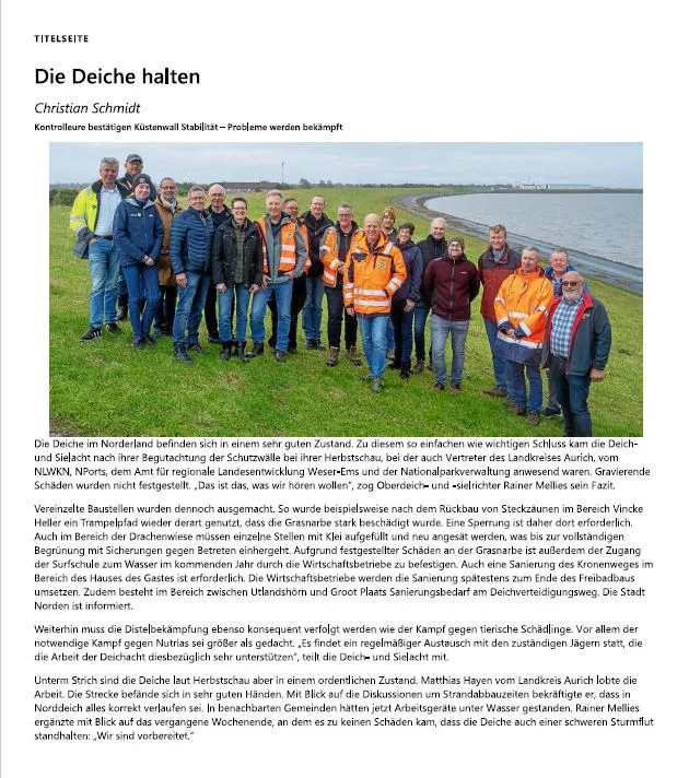 Am 6. Oktober 2025 wurde auf Einladung des Landkreises Aurich die Herbstdeichschau im Verbandsgebiet der Deich- und Sielacht Norderland durchgeführt. Mit Vertretern des Landkreises Aurich, des Niedersächsischen Landesbetrieb für Wasserwirtschaft, Küsten- und Naturschutz (NLWKN), Niedersachsen Ports, des Domänenamtes sowie der Nationalparkverwaltung wurde am frühen Morgen und bei gutem Wetter die Schau gestartet.